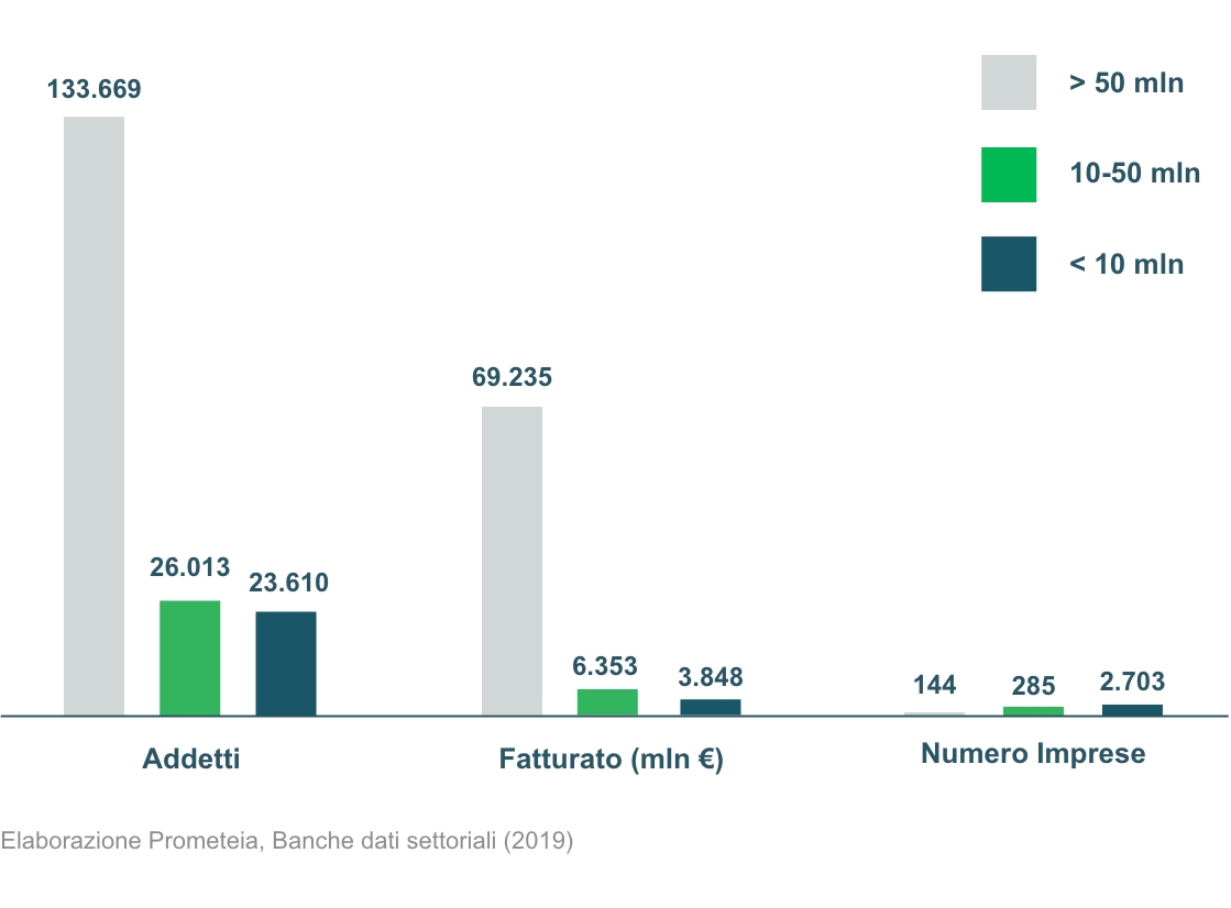 Un ulteriore elemento strutturale che caratterizza il settore è legato alla dimensione media delle imprese. Se si osservano i numeri emerge come il tessuto produttivo dell’automotive sia caratterizzato da un elevato numero di piccole e medie imprese: quelle con un fatturato inferiore ai 10 milioni di euro rappresentano l’86% del totale, generano il 4.8% del fatturato complessivo e si avvalgono del 13% della forza lavoro.