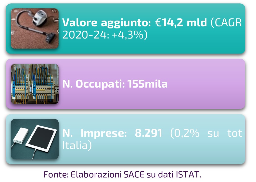 È un settore molto eterogeneo: si passa dalla fabbricazione di batterie e accumulatori a quella degli elettrodomestici, dai cablaggi alle apparecchiature elettriche per parrucchieri, solarium e centri estetici; è un settore che coinvolge diverse filiere. Tra queste, la filiera estesa degli elettrodomestici è una delle più rilevanti: tenendo conto sia della componentistica, sia degli elettrodomestici in senso stretto, sia della parte retail, il fatturato generato è pari a €114 miliardi, gli occupati sono oltre 500mila e gli investimenti pari a €1,3 miliardi.