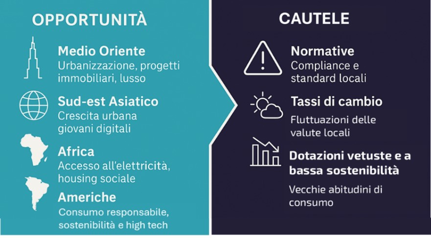 Nei Paesi del Golfo, l’urbanizzazione e le attività immobiliari trainano la domanda di apparecchiature per la ricarica di vetture elettriche, isolatori per l’elettricità, apparecchi per il riscaldamento, trasformatori elettrici, apparecchi per il collegamento di circuiti elettrici, aspirapolveri. Per offrire energia sufficiente nella regione, sono previsti investimenti che porteranno la generazione a crescere del 33% in 10 anni, in particolare grazie al solare, e saranno fondamentali le connessioni agli utenti finali. Le reti sono oggetto di investimenti per l’ampliamento della copertura e il potenziamento nel Sud-Est asiatico, America Latina e nel continente africano.