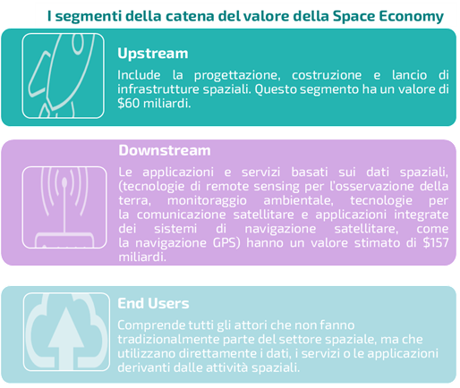 La Space Economy è definita dall’OCSE come l’intera gamma di attività e l’utilizzo delle risorse che creano valore e benefici per gli esseri umani nell’ambito dell’esplorazione, della ricerca, della comprensione, della gestione e dell’utilizzo dello spazio.