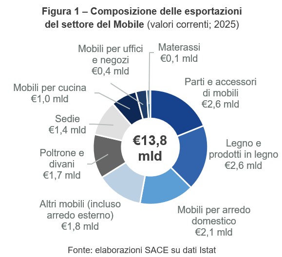 Il settore si distingue nel panorama internazionale per l’eleganza del design, l’eccellenza dei materiali e l’attenzione artigianale, elementi che rappresentano il fiore all’occhiello del Made in Italy e attraggono l’interesse dei consumatori di tutto il mondo. Il Mobile nel 2025 ha registrato esportazioni per €13,8 miliardi, in sostanziale stabilità rispetto all’anno precedente, di cui €11,2 miliardi di mobili in senso stretto (-1,2%; Fig. 1). L’andamento positivo dell’export di rilevanti comparti – come parti e accessori di mobili (+4,2%), legno e prodotti in legno (+3,5%), mobili per arredo domestico (+0,7%) e poltrone e divani (+1,4%) – si è contrapposto alle ampie riduzioni di altri mobili (incluso arredo esterno; -7,6%), sedie (-2,1%) e mobili per cucina (-5%).