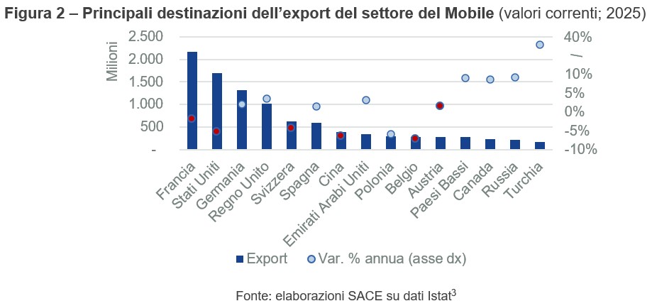 Guardando alle geografie di destinazione, si nota come la dinamica invariata sia stata influenzata in particolar modo dalle flessioni di Francia (-1,8%) e Stati Uniti (-5,3%), rispettivamente primo e secondo mercato di sbocco accogliendo insieme circa il 30% del totale: sulla domanda francese hanno pesato i cali di poltrone e divani e altri mobili (incluso arredo esterno); la richiesta statunitense, penalizzata dal complesso contesto commerciale causato dell’aumento dei dazi doganali, ha visto minori vendite di mobili per arredo domestico, parti e accessori di mobili e altri mobili (incluso arredo esterno; Fig. 2).