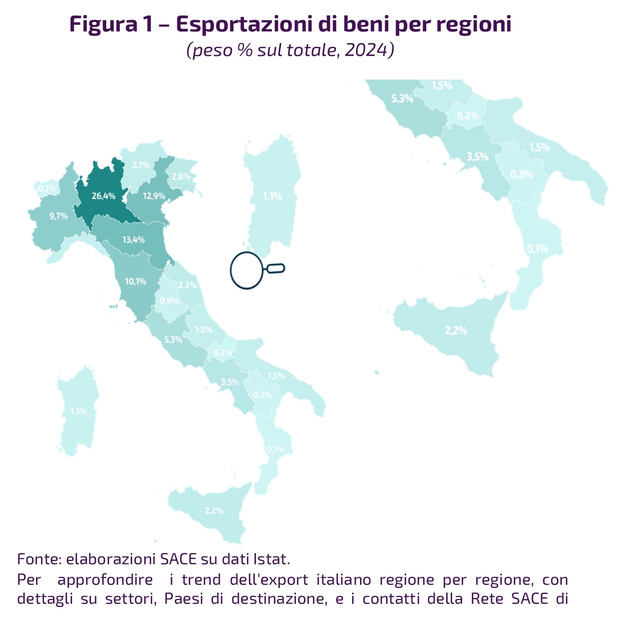 Anche l’export della Puglia è risultato in flessione: la regione, che conta oltre 272mila imprese, ha esportato €7,2 miliardi di beni nel periodo gennaio–settembre 2025. Andamenti negativi si registrano inoltre in Sardegna (-11,5%) e in Molise (-7,7%), dove la crescita delle esportazioni di mezzi di trasporto e di alimentari e bevande non è stata sufficiente a compensare la contrazione dei prodotti chimici. Al contrario, hanno mostrano una dinamica positiva le esportazioni di Abruzzo (+8,9%), trainate in particolare dal comparto farmaceutico (+61,5%), e Calabria (+9,2%), sostenute soprattutto da alimentari e bevande, meccanica strumentale e prodotti in metallo.
