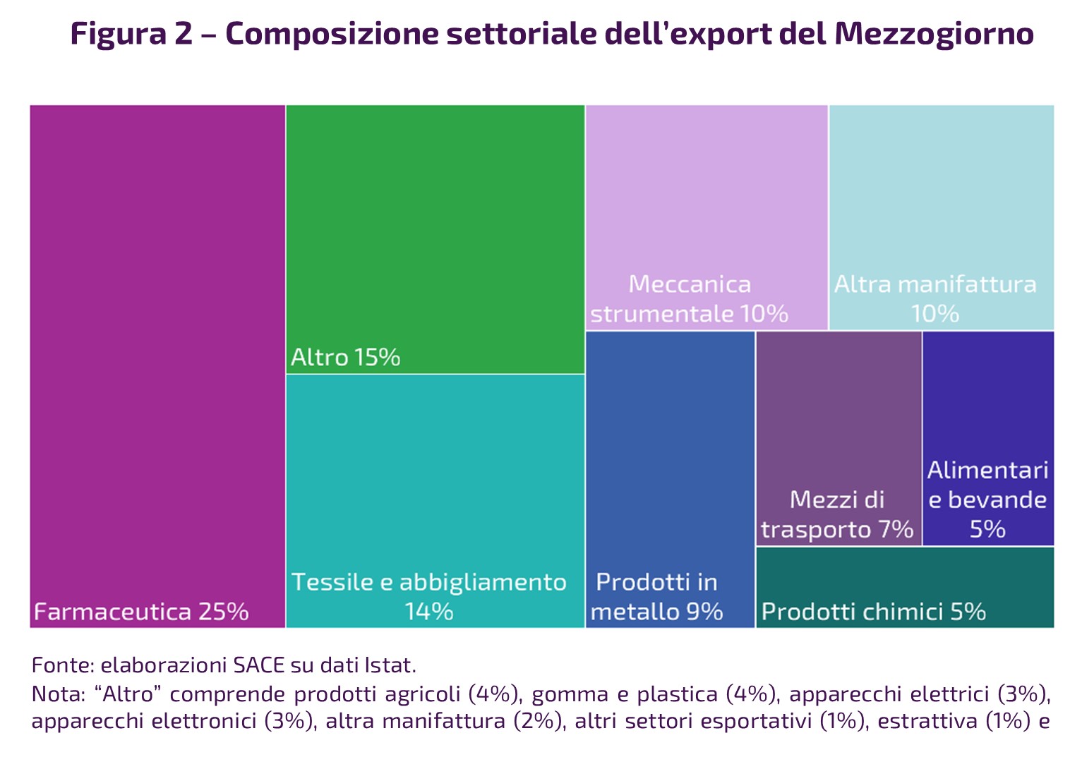 La composizione settoriale delle vendite estere dell’area è molto diversificata e la performance realizzata nei primi 9 mesi del 2025 è eterogenea (Fig. 2): il rialzo di farmaceutica (+19,1%), alimentari e bevande (+2,6%), prodotti in metallo (+2,2%) e meccanica strumentale (+9,5%), che insieme rappresentano oltre il 40% dell’export totale del Mezzogiorno, ha infatti compensato la contrazione di altri importanti settori quali raffinati (-16,8%), mezzi di trasporto (-7,5%) e prodotti chimici (-9,6%).