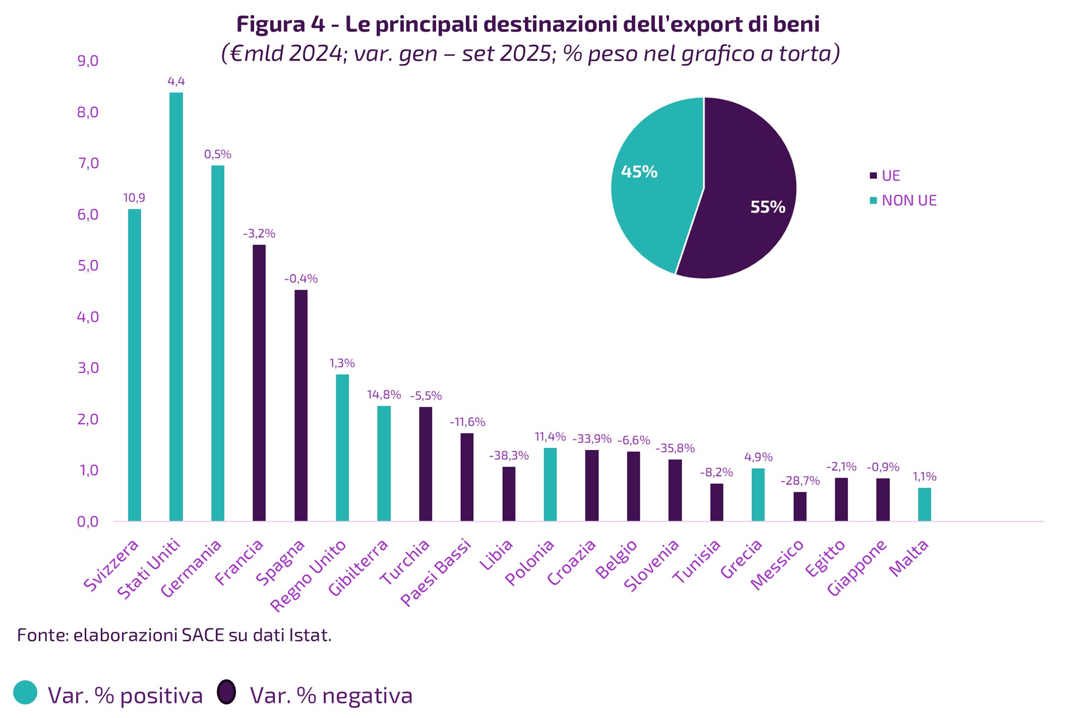 Nei primi nove mesi dell’anno, l’export ha trovato slancio soprattutto nei mercati chiave, che continuano a rappresentare il perno delle vendite oltreconfine. Svizzera, Stati Uniti e Germania — insieme destinatari di circa un terzo delle esportazioni complessive — hanno mostrato un andamento complessivamente positivo. In particolare, la Svizzera si distingue per una crescita a doppia cifra (+10,9%), sostenuta dal dinamismo della farmaceutica, mentre gli Stati Uniti rafforzano il proprio ruolo strategico grazie a un incremento del 4,4%, trainato da un vero e proprio exploit del comparto farmaceutico (+74%) legato al cosiddetto effetto “front-loading” per anticipare gli aumenti dei dazi annunciati durante il “Liberation Day” di aprile. Più contenuto, ma comunque in territorio positivo, l’andamento verso la Germania (+0,5%), che si conferma un mercato stabile e imprescindibile. Fa da contrappeso la Francia, dove le esportazioni arretrano del 3,2%, penalizzate soprattutto dalla flessione dei mezzi di trasporto, segnalando le difficoltà di alcuni comparti tradizionali.
