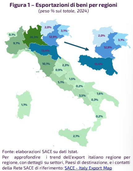 L’Emilia-Romagna, che conta oltre 383mila imprese attive di cui 22mila PMI, è la seconda regione italiana per export con una quota del 13,4% sulle vendite nazionali complessive, pari, nei primi 9 mesi dell’anno, a €63 miliardi (+0,5% rispetto allo stesso periodo del 2024), mentre il Veneto è la terza, con una quota del 12,9%, €59 miliardi (-0,6%) e 413mila imprese di cui 26mila PMI. Seguono il Friuli-Venezia Giulia (quota del 3,1%; €16 miliardi e +22,5%) e il Trentino-Alto Adige (quota del 2%; €10 miliardi e -1,5%).