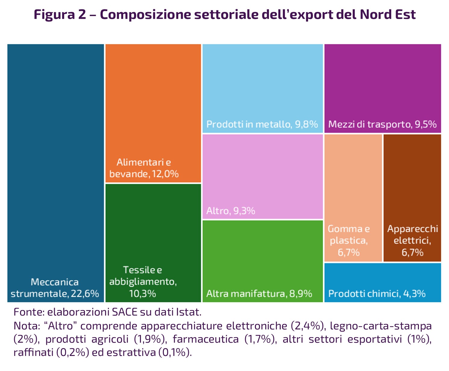 La composizione settoriale delle vendite estere dell’area è molto diversificata e la performance realizzata nei primi 9 mesi del 2025 è eterogenea (Fig. 2): il rialzo di mezzi di trasporto (+14,1%) e alimentari e bevande (+6,1%) – sulla spinta, i primi di navi e imbarcazione, i secondi di prodotti delle industrie lattiero-caseari, altri prodotti alimentari e prodotti a base di carne - e in misura minore di meccanica strumentale (+0,6%, ma con un peso del 22,6% sul totale export dell’area) hanno compensato la flessione della maggior parte dei principali settori quali: tessile e abbigliamento (-4,4%), apparecchi elettrici (3,1%), prodotti in metallo (-2%).