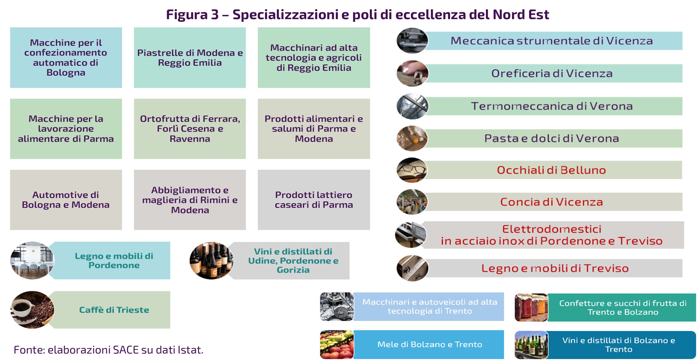 Quel che fa grande una regione (e un’area) sono le tante eccellenze territoriali riconosciute in tutto il mondo (Fig. 3). Ciascuna regione ha le sue peculiarità che si riflettono negli svariati prodotti di alta qualità. Le specializzazioni sono il risultato di storie di successo che vanno oltre la singola impresa, nate da condivisioni di risorse, competenze e innovazioni, che spesso si sono evolute in distretti industriali per poi trovare la massima realizzazione nelle filiere produttive che coinvolgono l’intera catena del valore, dalla fornitura delle materie prime alla distribuzione del prodotto finale, integrando diverse fasi produttive e logistiche.