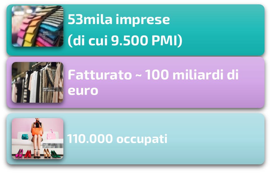 Il connubio tra qualità e creatività, che caratterizza il BBF, è l’anima delle produzioni di tessile e abbigliamento Made in Italy. I grandi marchi italiani mantengono una posizione dominante, grazie all’immagine consolidata di prestigio e status symbol. Il Sistema moda resta un settore di rilevanza strategica per l’economia italiana. Con un giro d’affari di quasi €100 miliardi prodotto da 53mila aziende (di cui 9.500 PMI), l’industria del T&A produce €30 miliardi l’anno in termini di valore aggiunto, contribuendo direttamente all’1,4% del PIL. A ciò si aggiungono altri €38 miliardi di impatto indiretto lungo le filiere coinvolte e poco meno di €9 miliardi di indotto, per un contributo complessivo al PIL del 3,9%. Il settore impiega 110mila persone, impiegati in larga parte nei trentasette distretti industriali che costituiscono la spina dorsale della filiera.